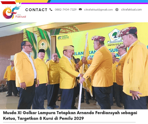 LAMPUNG UTARA, (CF) – Musyawarah Daerah (Musda) XI Dewan Pimpinan Daerah (DPD) Partai Golkar Kabupaten Lampung Utara (Lampura) secara aklamasi menetapkan Arnando Ferdiansyah sebagai Ketua DPD Partai Golkar Lampura. Penetapan sekaligus pelantikan Arnando Ferdiansyah ini menjadi penanda awal konsolidasi besar Golkar Lampura dalam menyongsong Pemilu 2029.