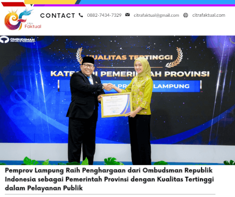 JAKARTA, (CF) – Pemerintah Provinsi Lampung meraih penghargaan dari Ombudsman Republik Indonesia sebagai pemerintah provinsi dengan kualitas tertinggi dalam pelayanan publik.