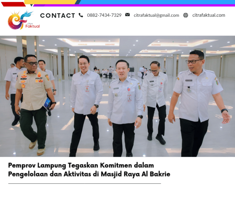 BANDARLAMPUNG, (CF) — Gubernur Lampung Rahmat Mirzani Djausal menegaskan Pemerintah Provinsi Lampung akan terus hadir dalam tindak lanjut pengelolaan dan aktivitas di Masjid Raya Al Bakrie. Menurut Gubernur Mirza, Masjid kebanggaan masyarakat ini tidak saja menjadi tempat ibadah tetapi juga landmark daerah.